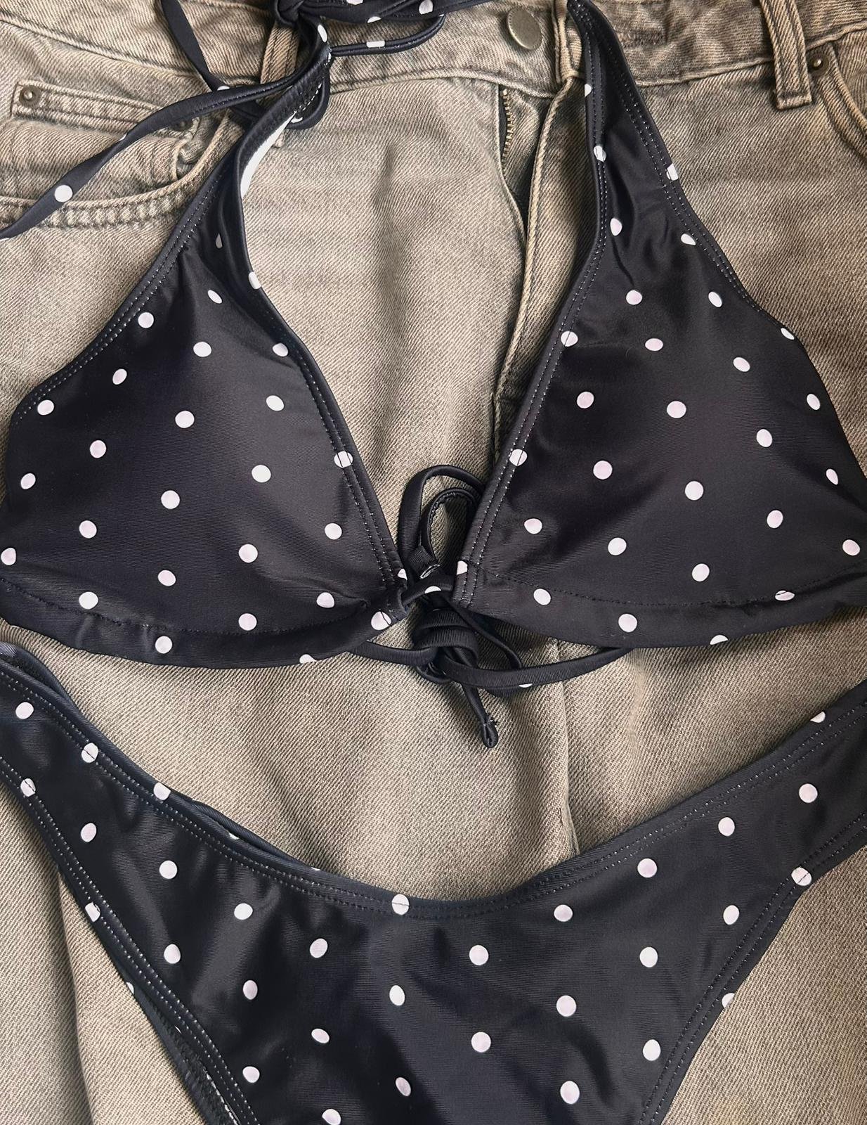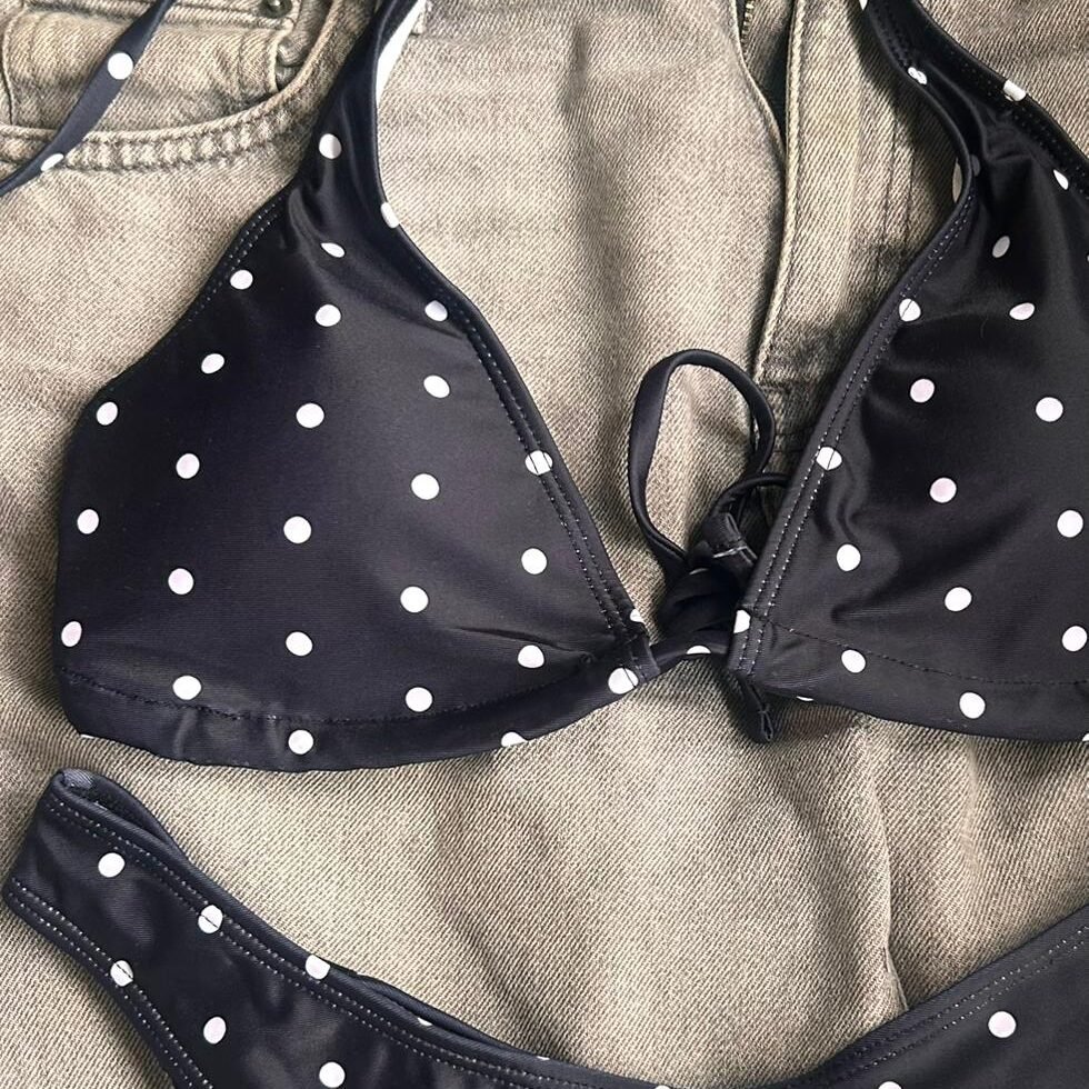 Su estampado de lunares aporta un estilo femenino y atemporal, perfecto para quienes buscan un bikini clásico pero con presencia.